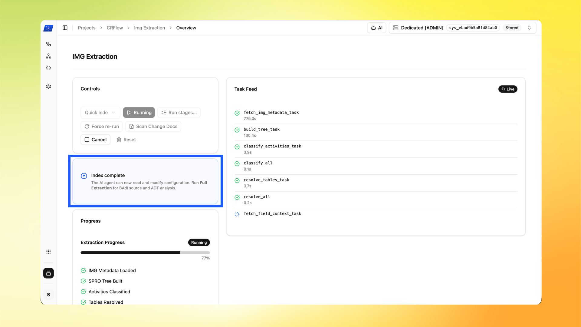 - Wait for indexing/extraction to progress. When you see Index complete, the agent can read and modify configuration with better context.